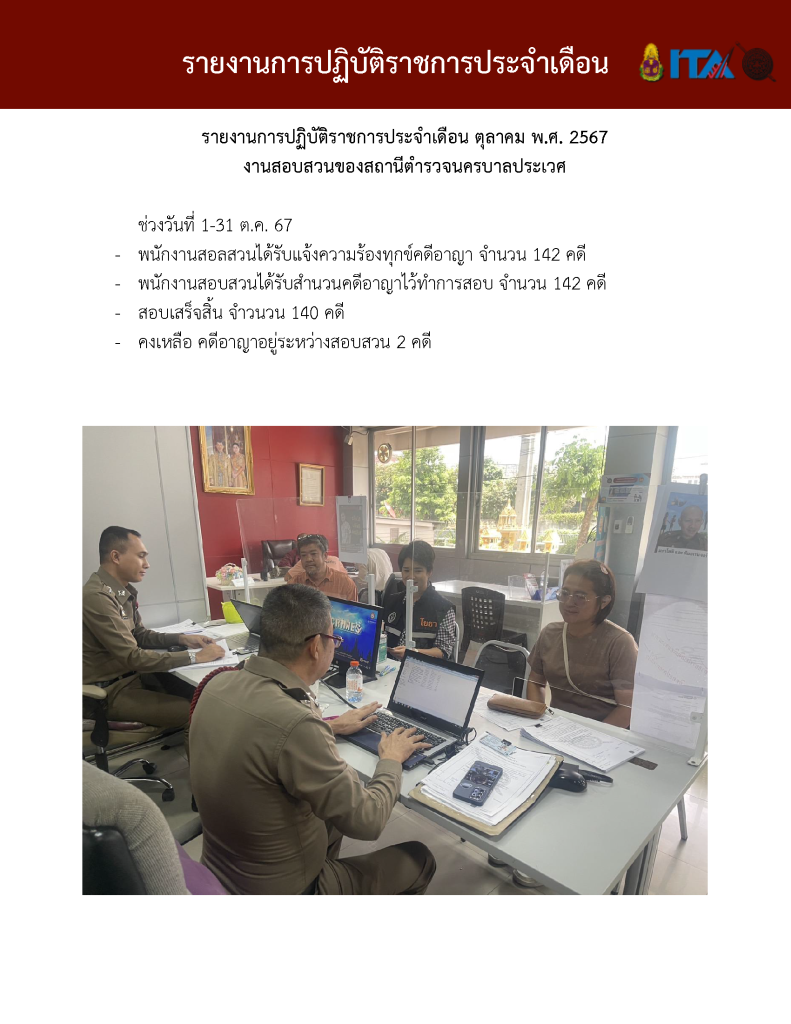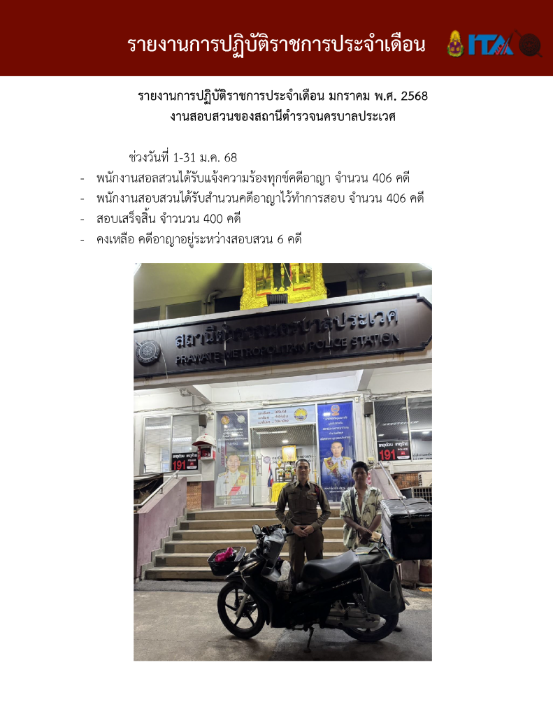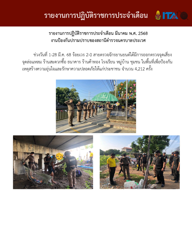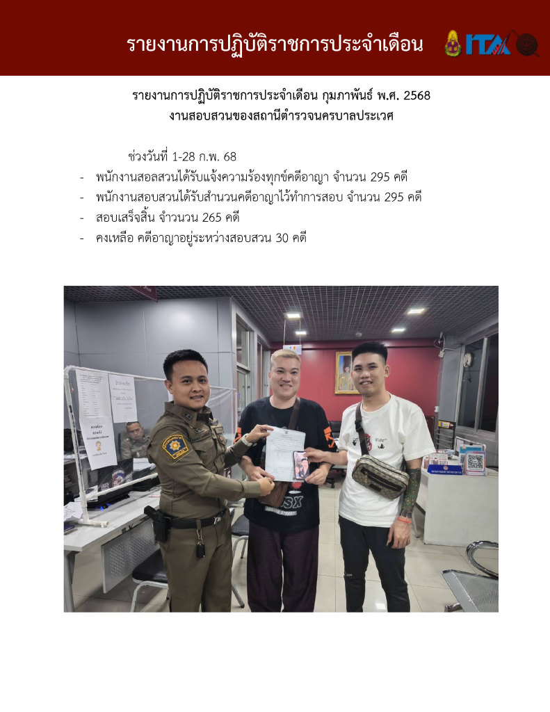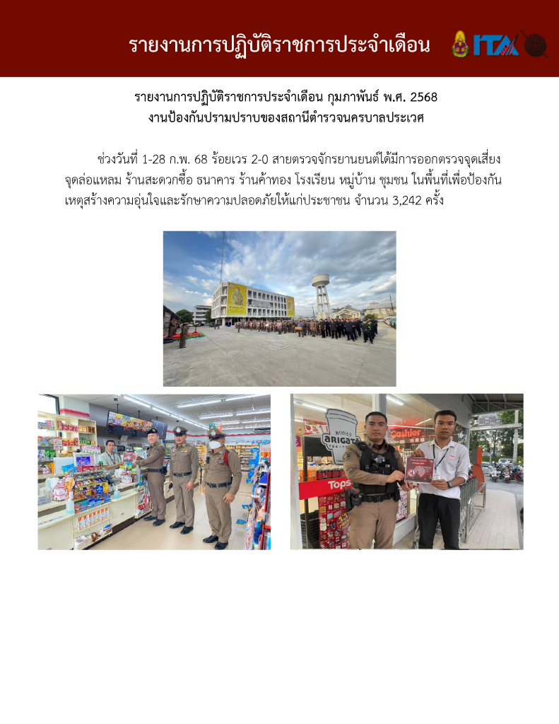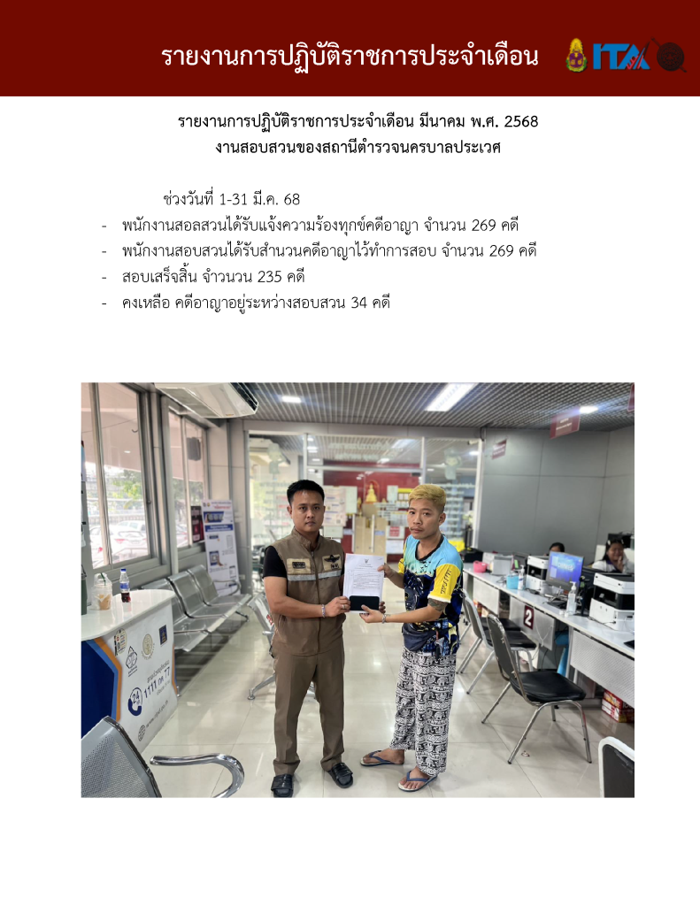 O7 รายงานการปฏิบัติราชการประจำเดือน รายงานการปฏิบัติราชการ ประจำปีงบประมาณ พ.ศ. 2568 รายงานการปฏิบัติราชการงานป้องกันปรามปราบปี 2568 ตุลาคม 2567 - มีนาคม 2568 Download PDF Download Word รายงานการปฏิบัติราชการงานจราจรปี 2568 ตุลาคม 2567 - มีนาคม 2568 Download PDF Download Word รายงานการปฏิบัติราชการงานสอบสวนปี 2568 ตุลาคม 2567 - มีนาคม 2568 Download PDF Download Word รายงานการปฏิบัติราชการงานสืบสวนปี 2568 ตุลาคม 2567 - มีนาคม 2568 Download PDF Download Word รายงานการปฏิบัติราชการงานธุระการปี 2568 ตุลาคม 2567 - มีนาคม 2568 Download PDF Download Word